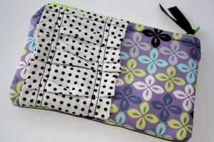 This pouch features a light purple with clover shapes fabric with a tiny polka dot ruffle. The lining is also the white and black polka dots.